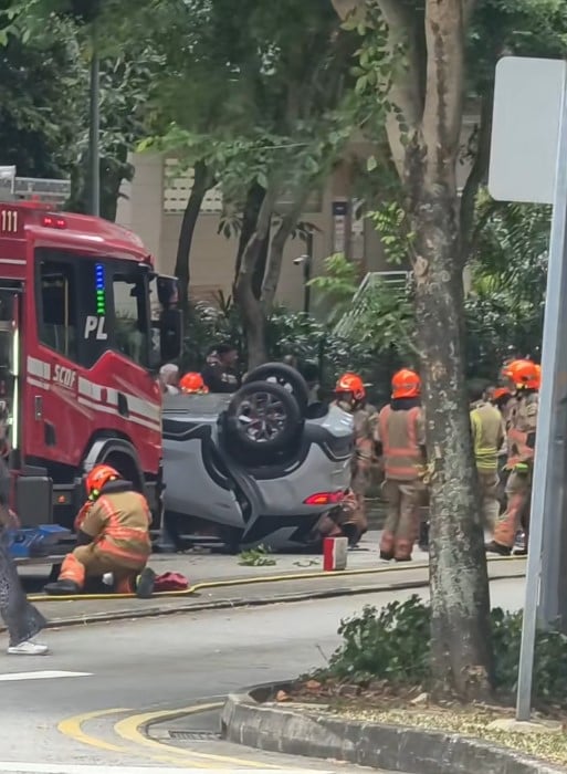 SCDF personnel at the scene after car flips over in River Valley
