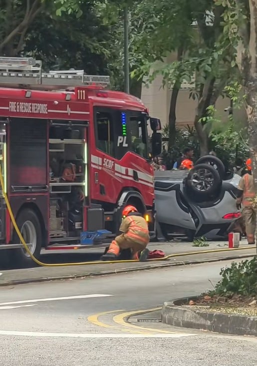 Several SCDF personnel surrounded the overturned car, especially near its front passenger seat.