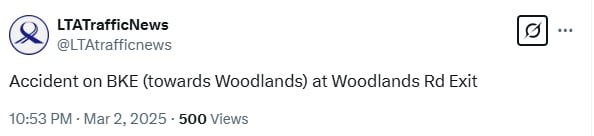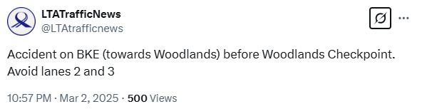 The Land Transport Authority’s (LTA’s) traffic news account on X posted about the accident at 10.53pm on Sunday (2 March).
