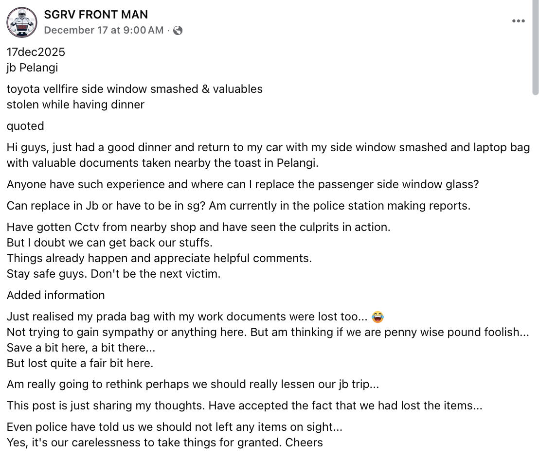 The motorist, who is believed to be from Singapore, reported the vehicle break-in on the Singapore Road Vigilante (SGRV) Facebook page.