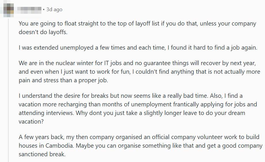 One Redditor suggested upskilling and using the time off to attend SkillsFuture courses. The same user even revealed that they had taken a sabbatical twice in the past decade and managed to find new jobs after each break.