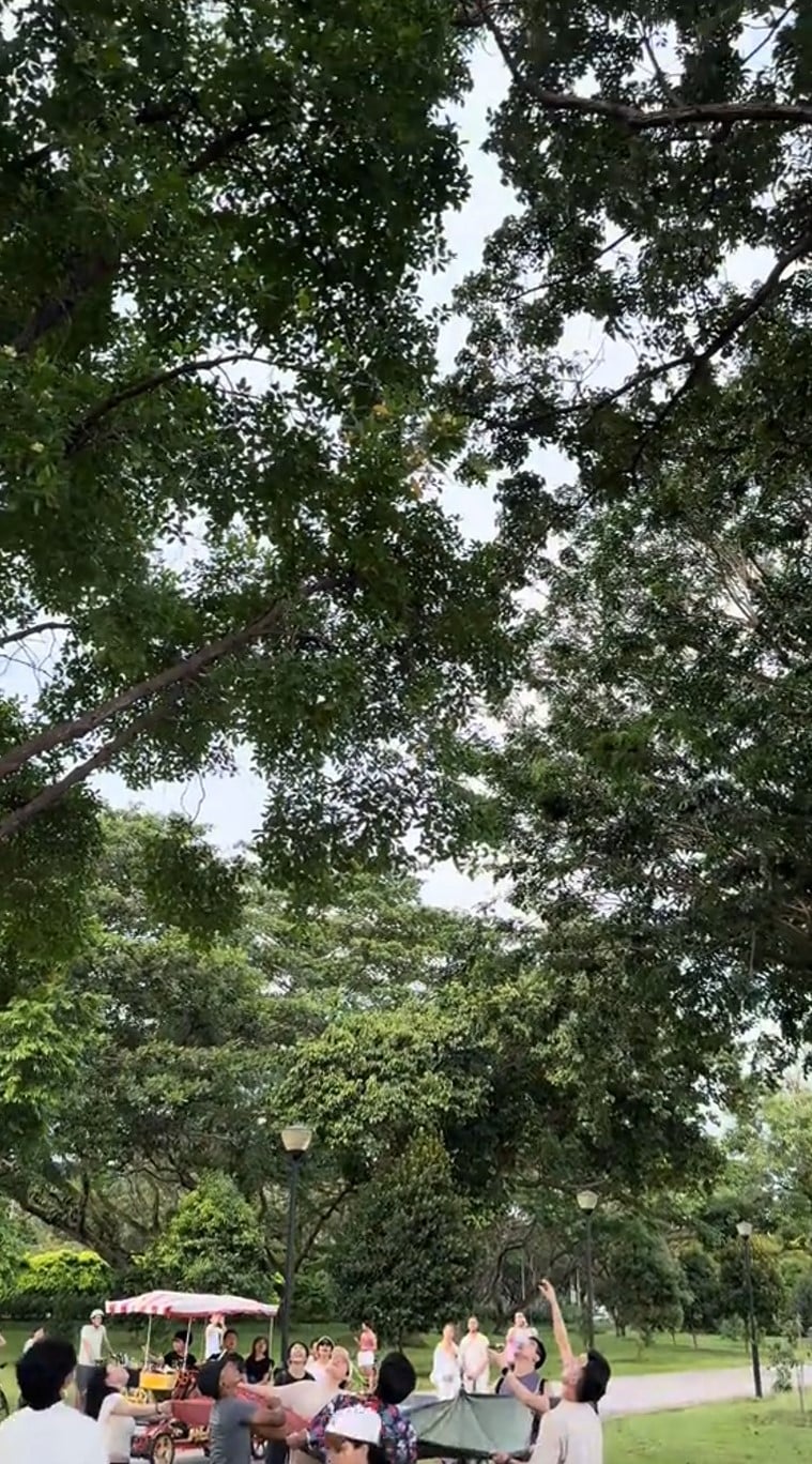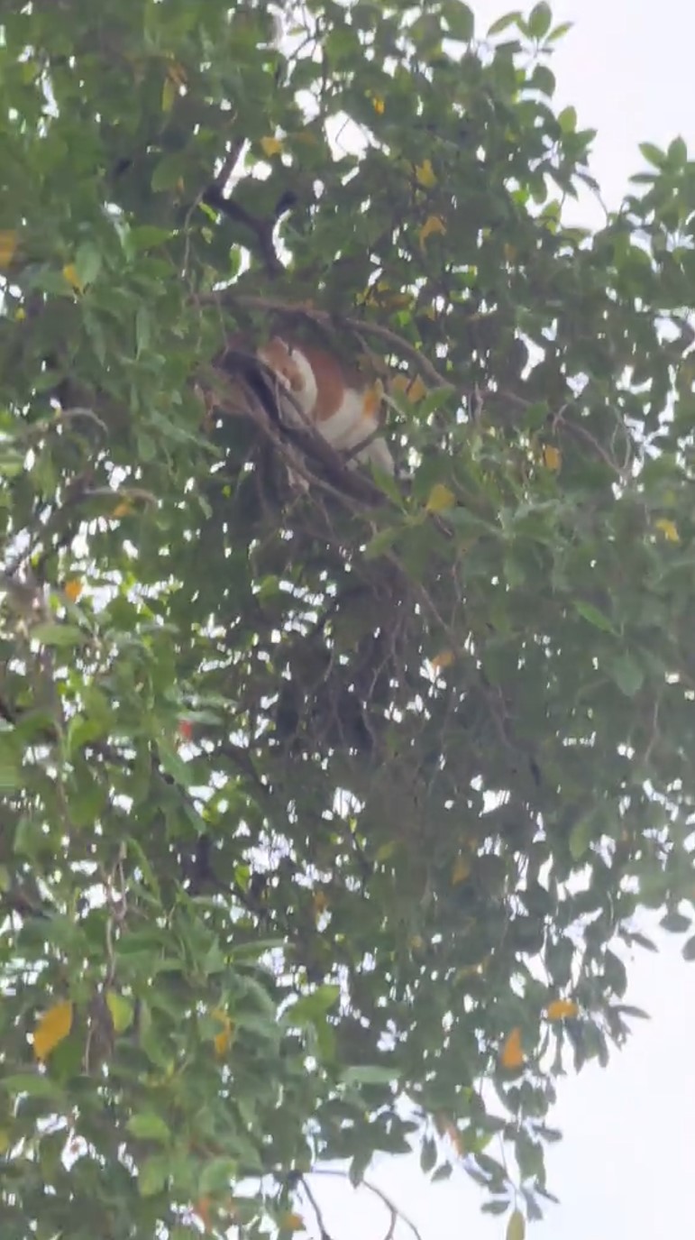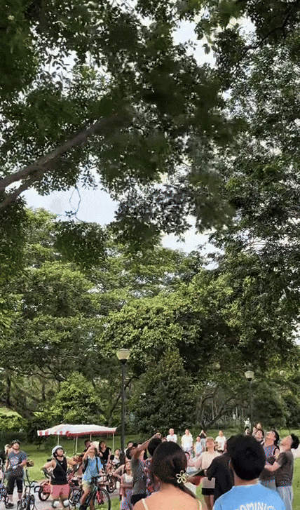 The video showed a large crowd gathered under a tree, all staring up into the canopy.