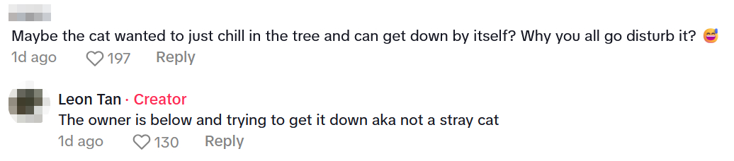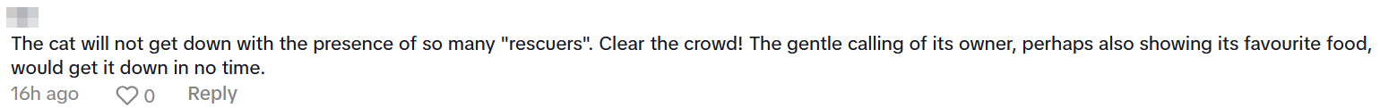 Mr Tan explained that the cat was not a stray, and its owner was trying to get their pet down.