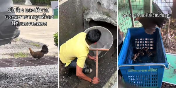 Mother hen cries for help after chicks get trapped in drain in Thailand, men use excavator to remove drain cover & save them