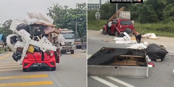 7 months ago Driver in M’sia hauls truckload of items on top of car, ends up scattering them all over road