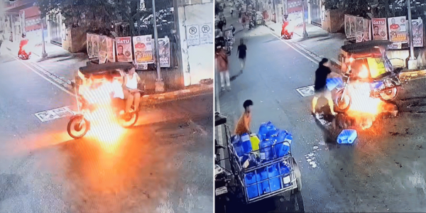 Motorised tricycle catches fire in Philippines, water delivery vehicle happens to pass by & puts out flames