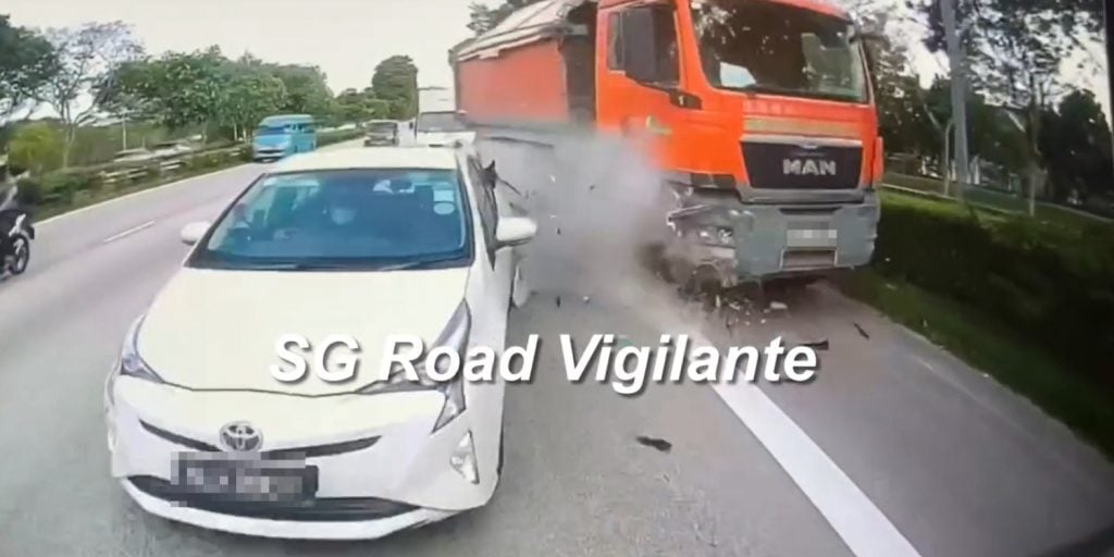 Truck slams into rear of car on SLE, driver manages to swerve onto road shoulder to lessen impact Netizens were divided on whether the truck driver was distracted or quick-thinking. 49 seconds ago