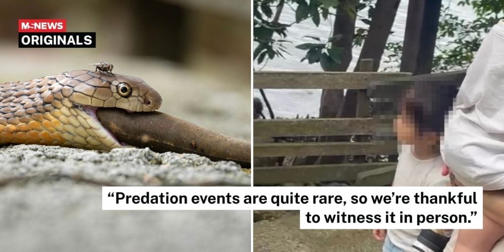 Family spots king cobra devouring prey at Sungei Buloh, children watch from 5m away It's believed that the snake was swallowing a young monitor lizard. 1 minute ago
