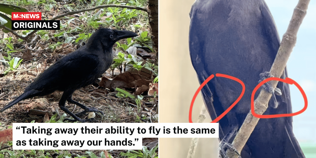 Man finds crow with clipped wings in Sengkang, suspects it was raised by humans & later abandoned The bird could only fly up to knee height due to its clipped wings. 21 seconds ago
