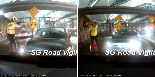 S’pore-registered car drives against flow of traffic in Johor Checkpoint, officer hits it with traffic cone