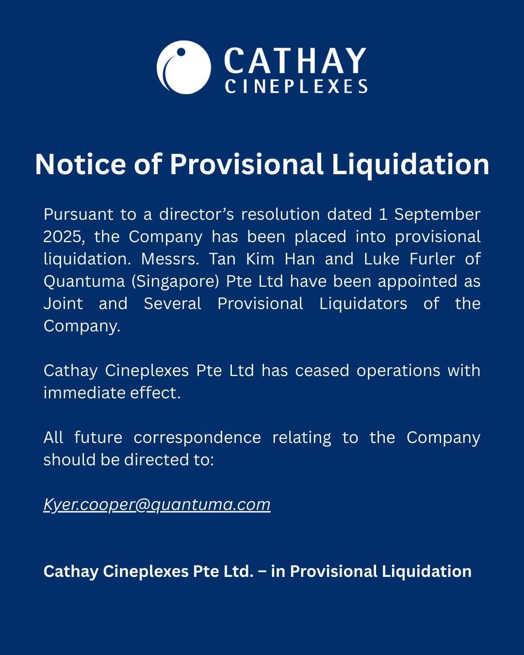 Cathay Cineplexes placed into provisional liquidation & ceases operations with immediate effect