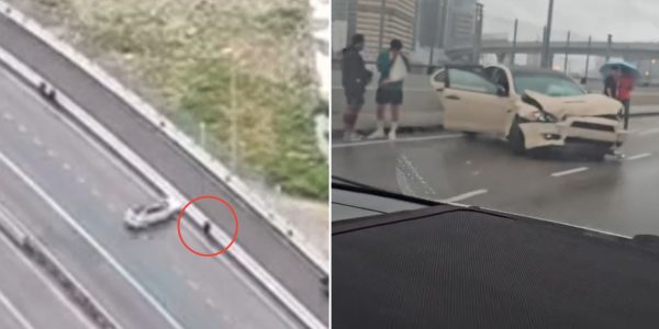 S’pore-registered car skids on wet Causeway, hits pedestrian & sends him flying