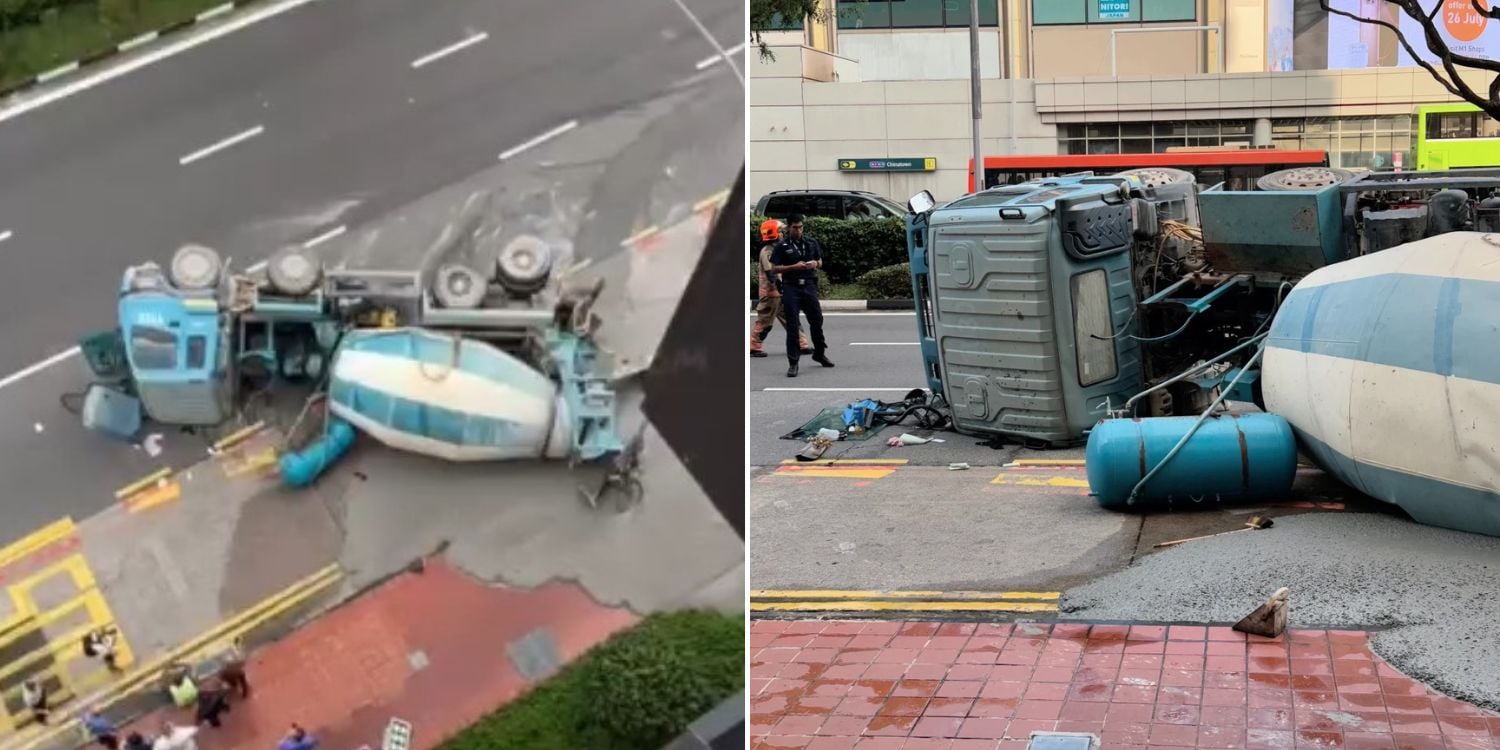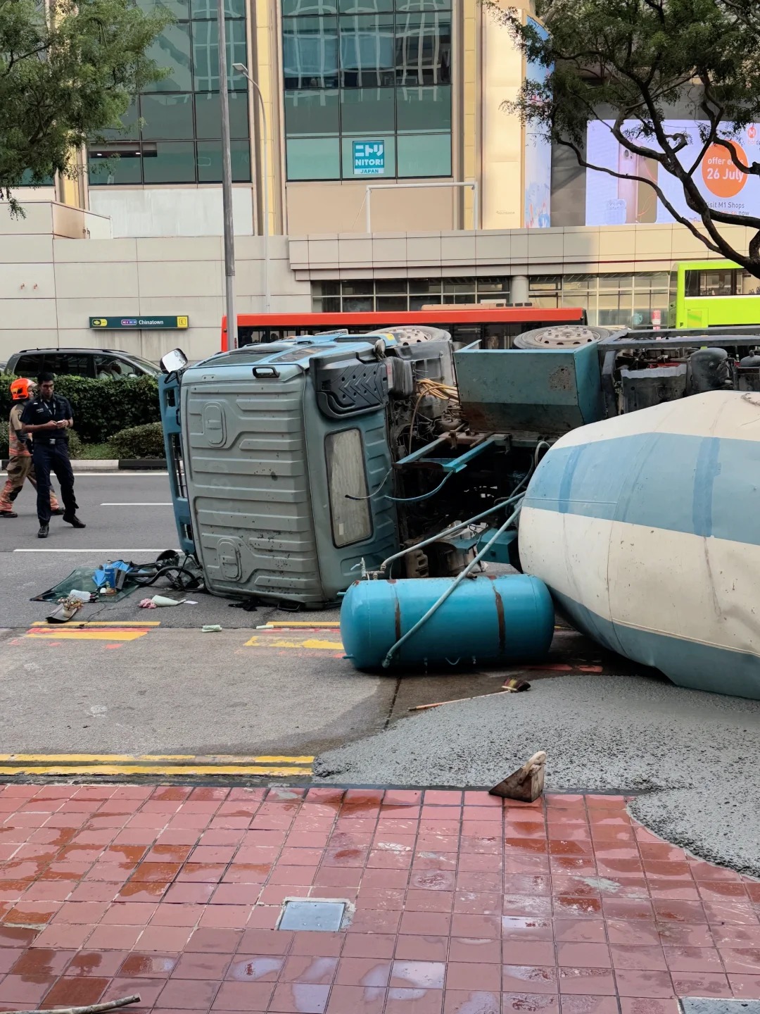 According to the images, the cement truck appeared to have toppled over in front of People’s Park Centre.