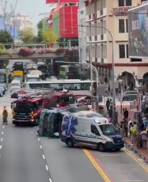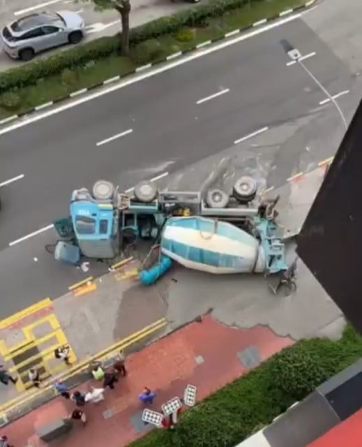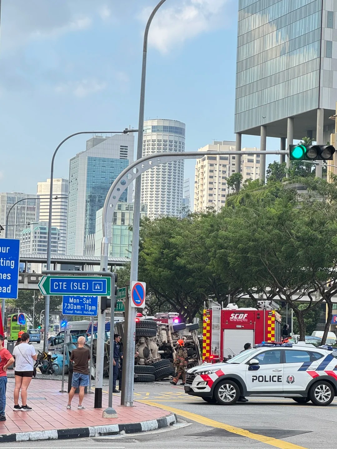 Footage of the aftermath posted by Singapore roads accident.com on Facebook showed the heavy vehicle lying on its side across two lanes of Eu Tong Sen Street.