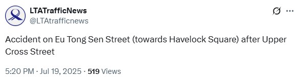 The Land Transport Authority posted on X at 5.20pm on Saturday (19 July) that the accident had taken place along Eu Tong Sen Street in the direction of Havelock Square, after Upper Cross Street.