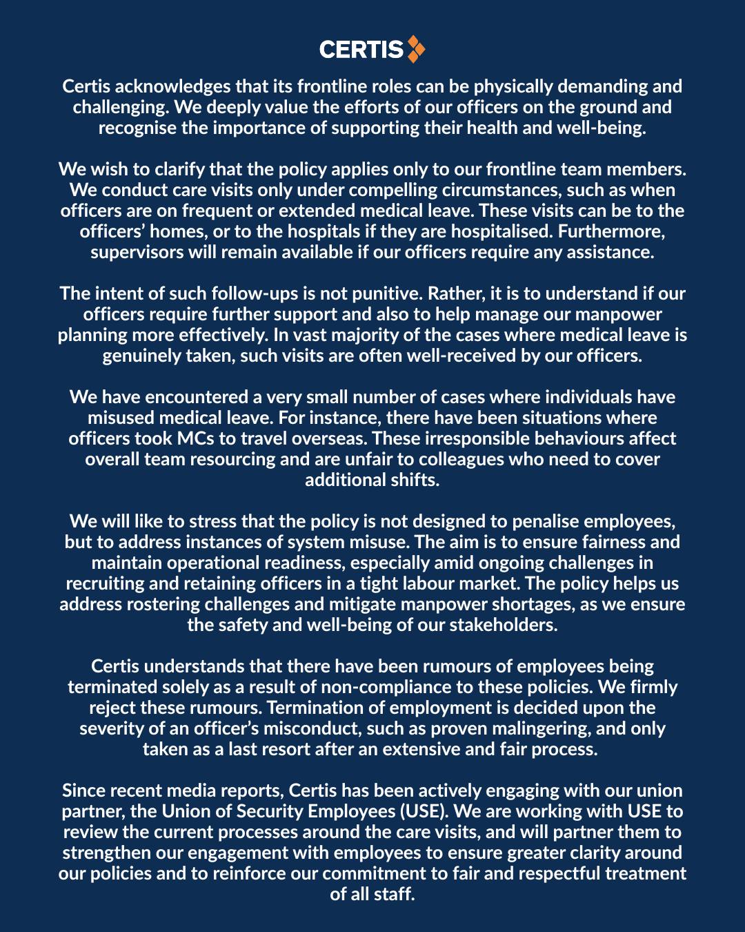 In a statement posted to social media on Tuesday (1 July), Ms Loo said USE is working with Certis to improve internal communications and ensure policies are clearly explained. She added that the union does not condone the abuse of medical leave, but emphasised the need for “fair and proper processes”.