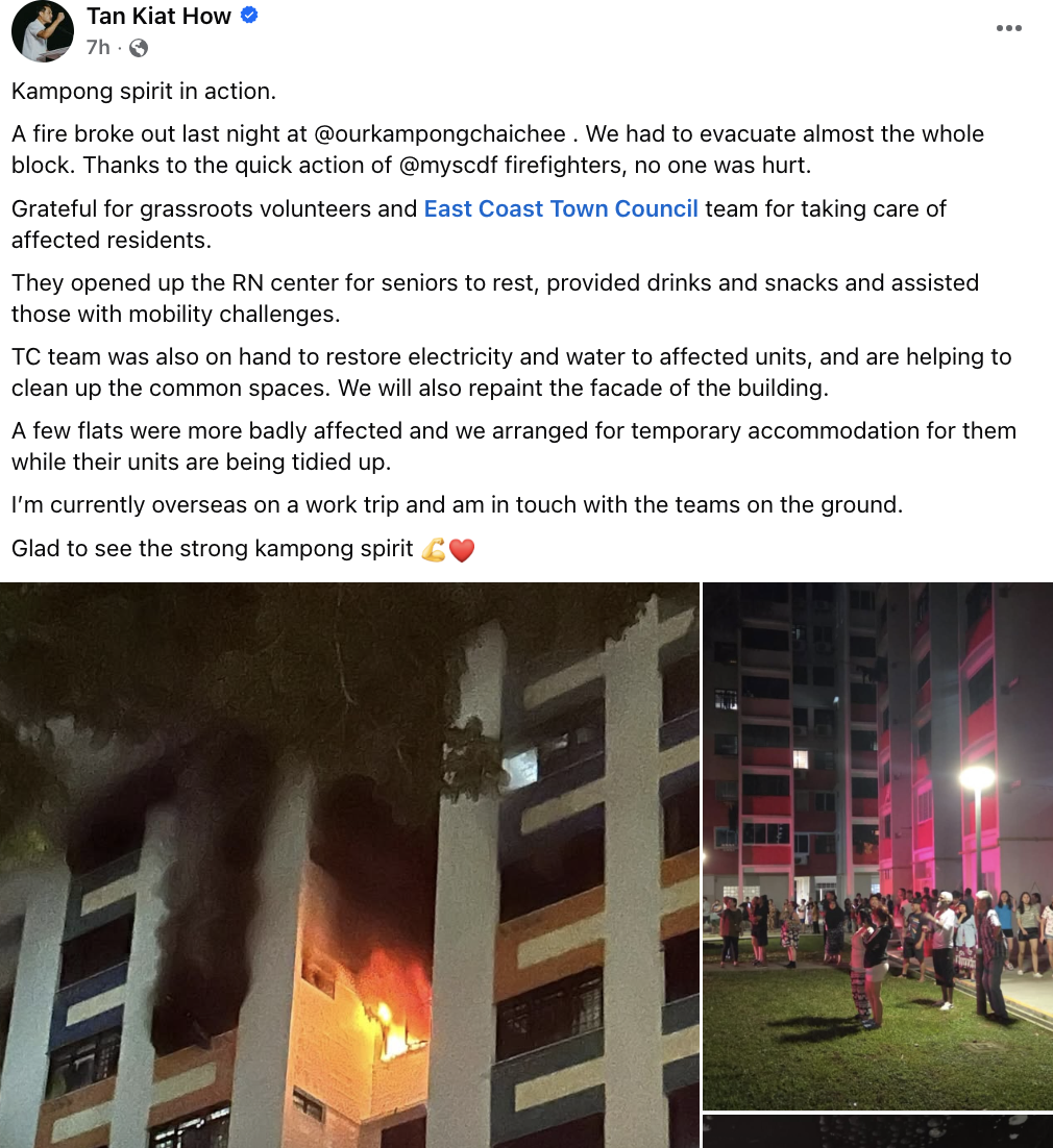 In a Facebook post the following day (6 Sept), Kampong Chai Chee MP Tan Kiat How praised the swift response of SCDF, the East Coast Town Council, and grassroots volunteers, calling it “kampong spirit in action”.