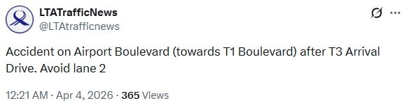 In a post on X at 12.21am on Saturday (4 April), the Land Transport Authority (LTA) said an accident had occurred along Airport Boulevard, in the direction of T1 Boulevard and after T3 Arrival Drive.