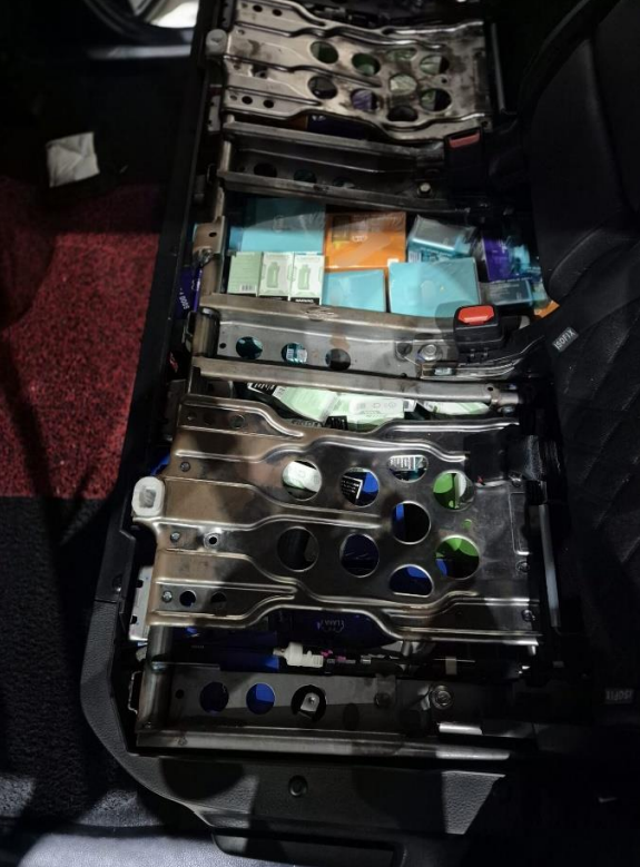 Photos released by HSA show the illicit items hidden beneath the rear passenger seat and inside the boot.