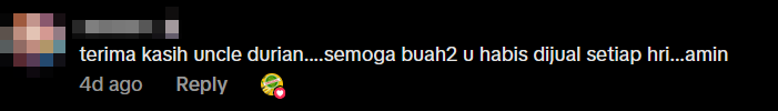 Translation: Thank you, Uncle Durian. May all your fruits be sold out every day. Amen.