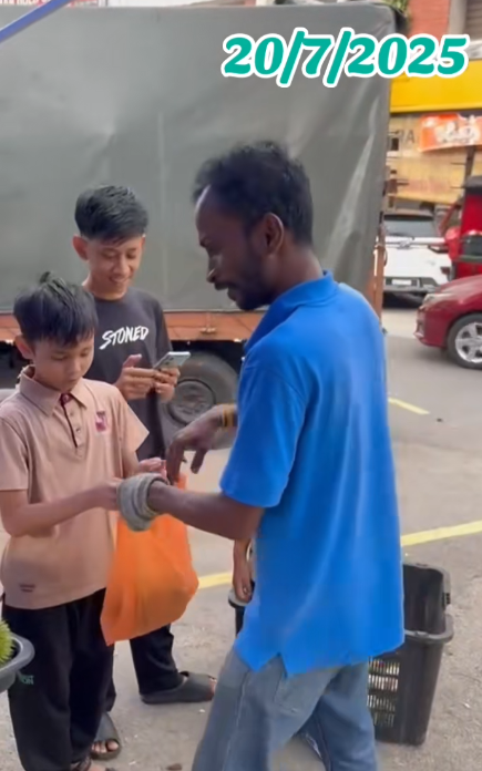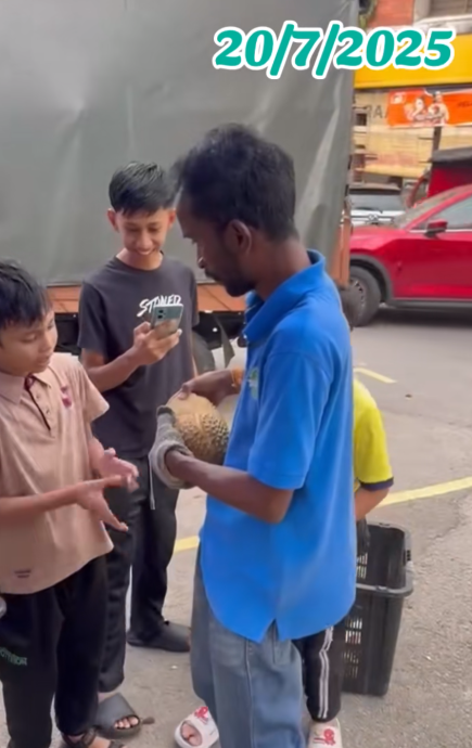 The stall owner refused to take their money. Instead, he handed the children back their money and gave them a whole Musang King durian for free.