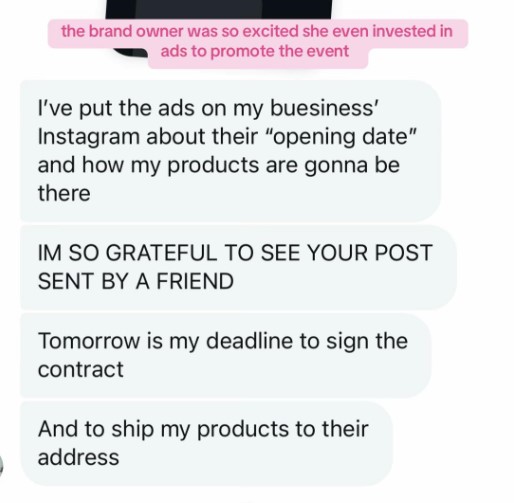 The other brands involved in the pop-up are also victims, it added, and while they don’t have high hopes of getting back their money, they want to spread awareness of the alleged scam in hopes that justice will be served.