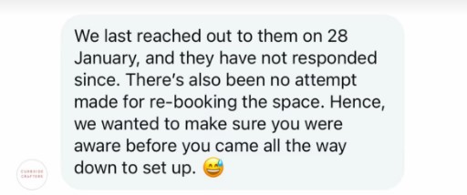 Curbside Crafters explained that its last communication with the consultancy had been on 28 Jan, with no attempt made to rebook the venue.