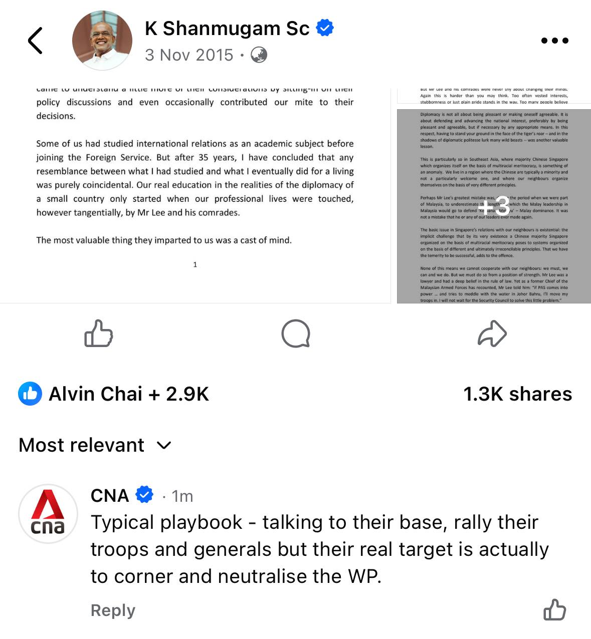 Screenshot of comment allegedly posted by CNA Facebook account on Minister Shanmugam’s old post goes viral