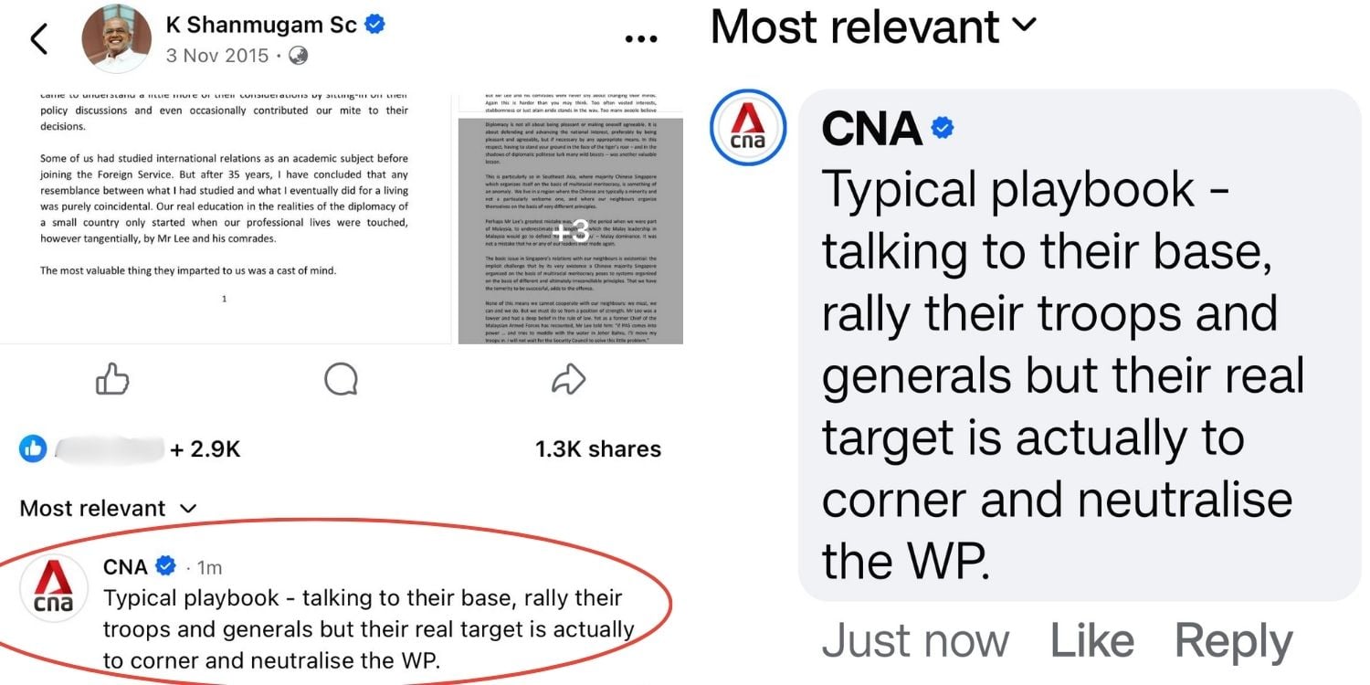On Thursday (16 Oct), a screenshot surfaced online, allegedly showing CNA’s verified Facebook account commenting under the post, “Typical playbook — talking to their base, rallying their troops and generals but their real target is actually to corner and neutralise the WP.”
