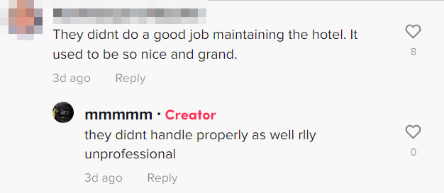One TikTok user highlighted that the hotel was in good condition in the past. She seemed disappointed to know that the OP faced such an issue.