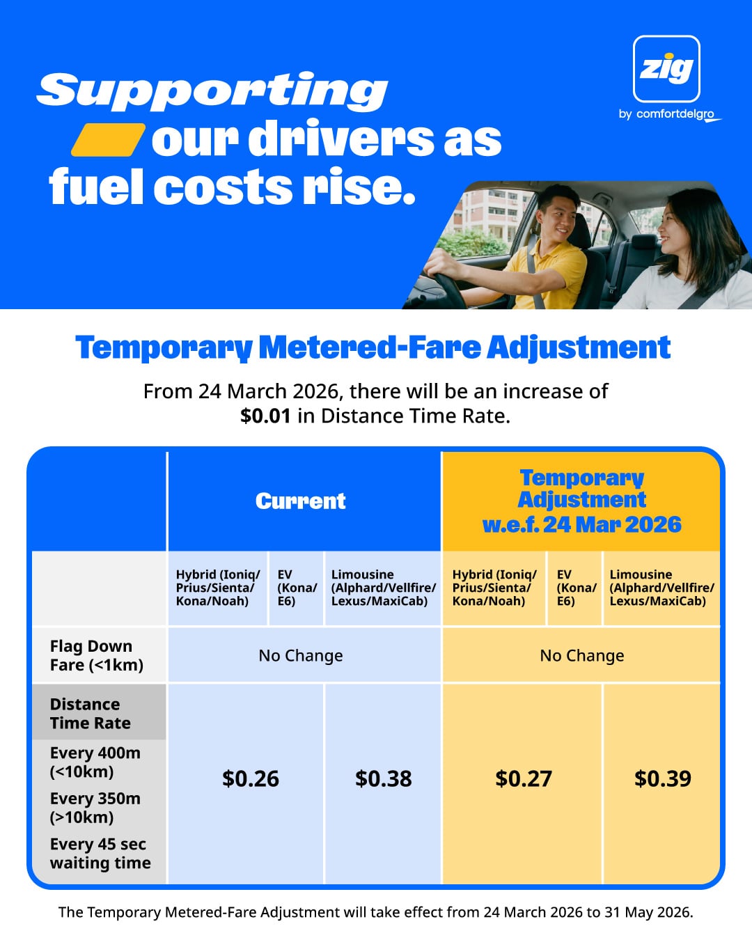 Zig by ComfortDelGro has announced a temporary fare adjustment to assist drivers in coping with the escalating cost of fuel, which has been driven by the ongoing Middle East conflict.