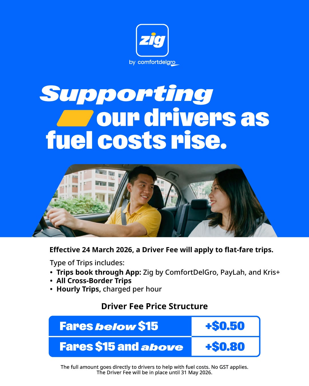 The company revealed on 17 March that it would introduce a new Driver Fee on flat-fare and hourly trips, including rides booked via Zig by ComfortDelGro, PayLah, and Kris+, as well as cross-border trips and hourly bookings.