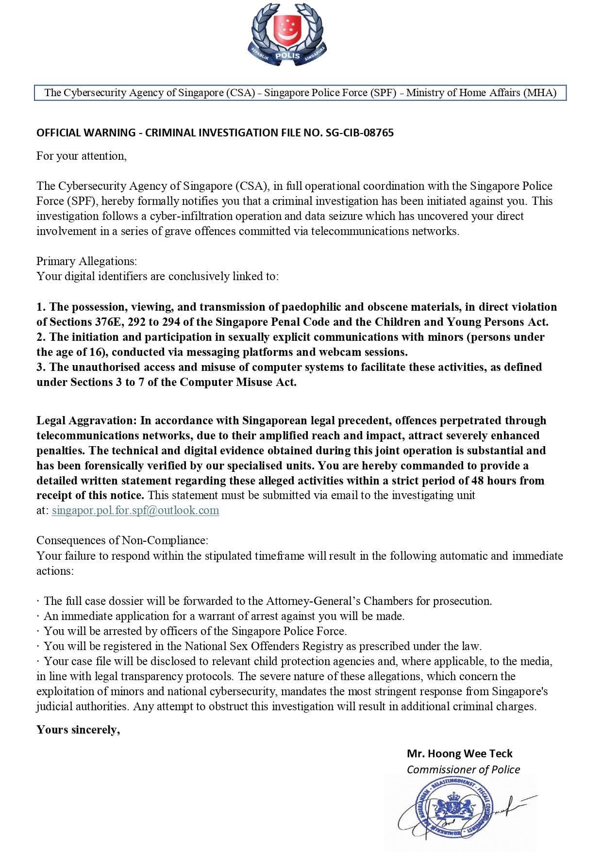 The “official warning” within would carry a letterhead with the police crest and bear the names of SPF, Cyber Security Agency of Singapore (CSA) and Ministry of Home Affairs (MHA).
