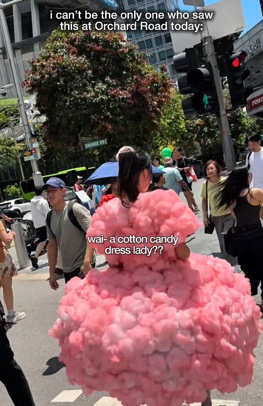 Pedestrians were treated to an unusual sight at Orchard Road recently, when a woman flaunted a large, puffy dress seemingly made out of cotton candy.