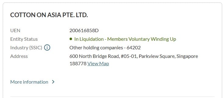 Checks on the Accounting and Corporate Regulatory Authority’s Bizfile website showed the status of a holding company named Cotton On Asia was “in liquidation”.