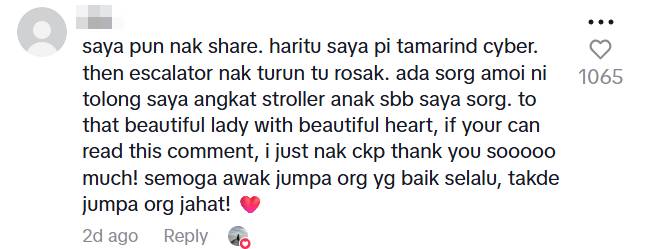 Translation: I also want to share. The other day, I went to Tamarind [Square in Cyberjaya], and the escalator going down was broken. There was a young woman who helped me carry my child’s stroller because I was on my own. To that beautiful lady with a beautiful heart, if you can read this, thank you so much. May you always meet kind people, and never encounter bad ones.