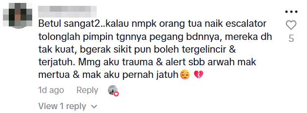 Translation: That’s very true. If you see an elderly person going on an escalator, please guide their hand and support their body. They’re no longer strong, and even the slightest movement can cause them to slip and fall. I’m truly traumatised and extra alert because my late mother-in-law and my mother have fallen before.