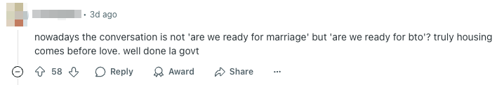 Another user highlighted the troubling issue that young couples face in Singapore — prioritising housing over love.