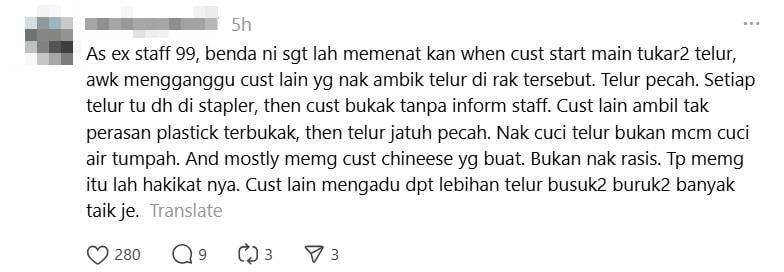 Translation: As a former 99 Speedmart staff member, this is extremely exhausting when customers start swapping eggs. You end up disturbing other customers who want to take eggs from the shelf. Eggs get broken. Each pack is already stapled, but customers open it without informing the staff. Other customers then pick it up without noticing that the plastic has been opened, and the eggs fall and break. Cleaning up broken eggs isn’t like wiping up spilled water. And most of the time, it’s Chinese customers who do this. I’m not trying to be racist, but that’s honestly the reality. Other customers complain about getting extra rotten eggs, lots of rotten, dirty eggs.