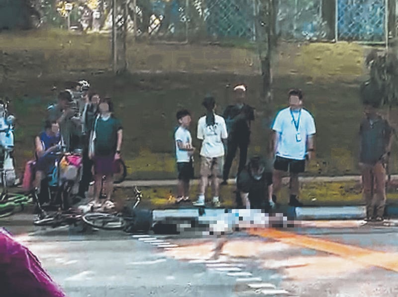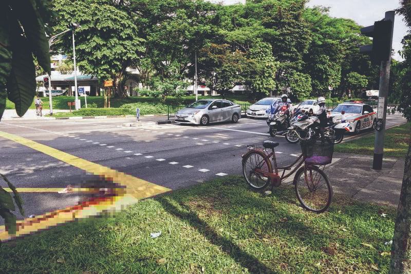 Images sent in by a Shin Min Daily News reader showed the white-haired lady lying in a pool of blood on the road, near a pedestrian crossing.