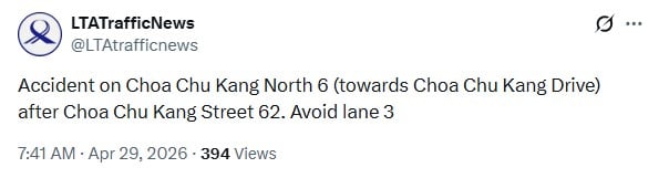 In a post on X, the Land Transport Authority (LTA) said an accident had occurred along Choa Chu Kang North 6, in the direction of Choa Chu Kang Drive after Choa Chu Kang Street 62.