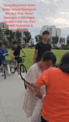 The TikTok video caption further claimed that the “young boy on bicycle knocked down a senior woman at NEX bus stop.”