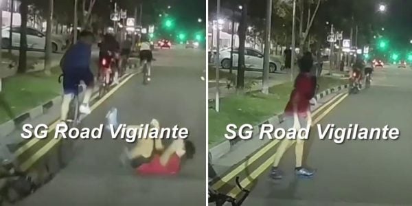 Cyclist without helmet rear-ends fellow rider & falls in front of moving car in Punggol