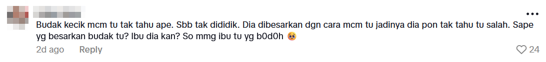 Translation: Little kids like that don’t know any better. They weren’t taught. She was raised like that, so she doesn’t even realise it’s wrong. Who raised the child? Her mum, right? So clearly, the mum’s the stupid one.