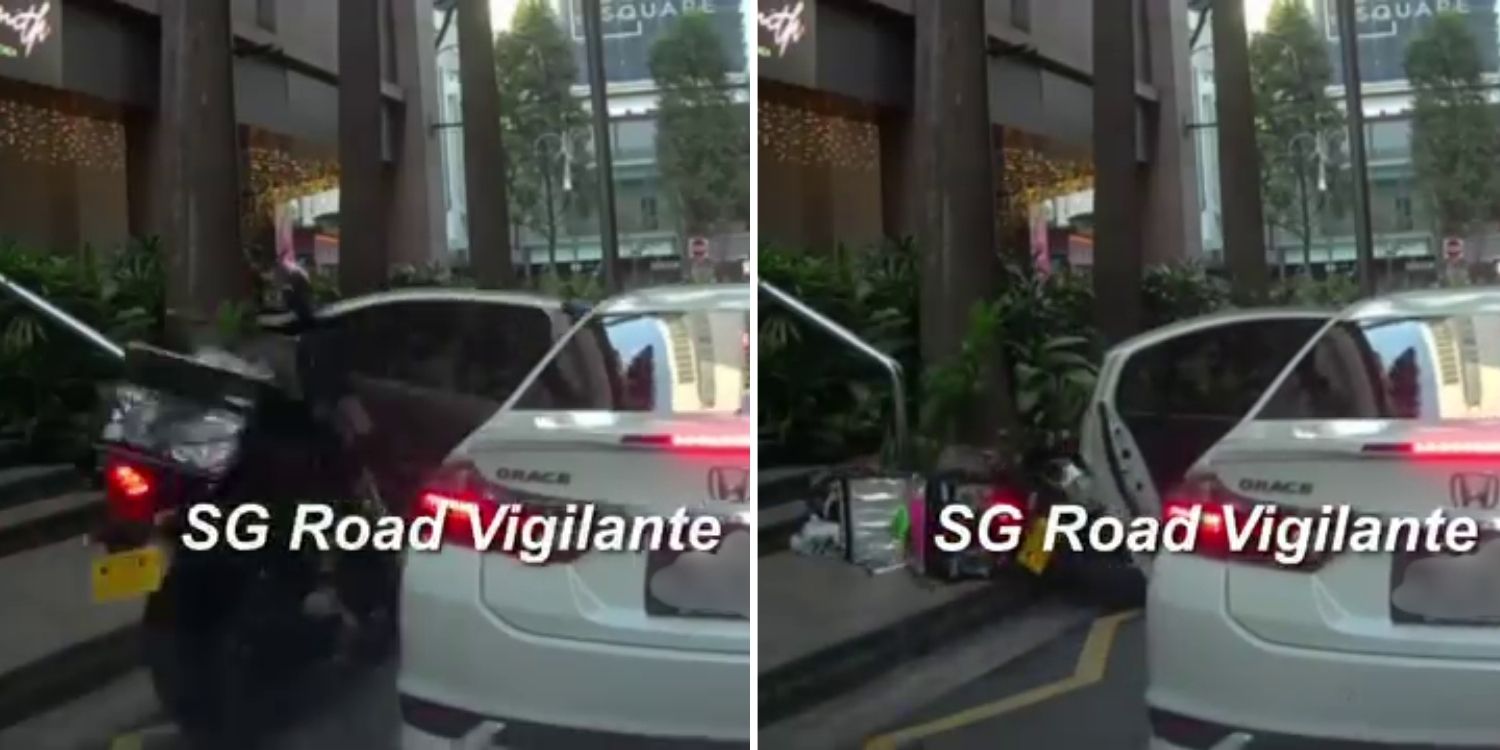A food delivery rider recently slammed into a car door opened by a passenger alighting at Shaw Centre — the impact of the collision knocked the motorcyclist off the bike.