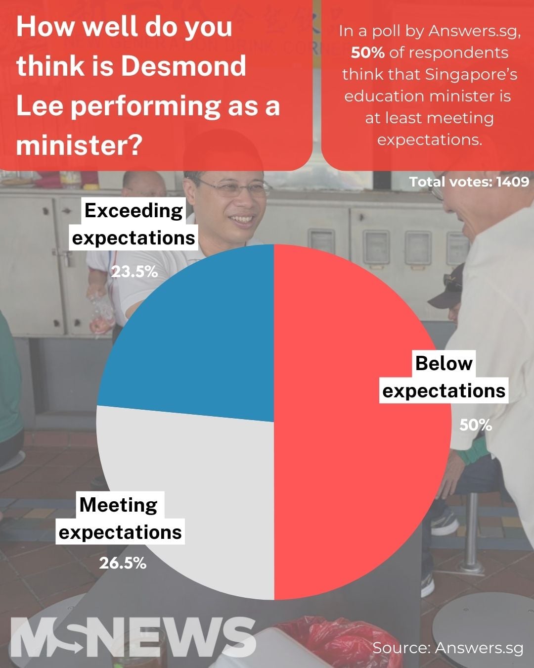 Public opinion on Minister for Education and Minister-in-Charge of Social Services Integration Desmond Lee appears evenly split, according to a recent Answers.sg survey.