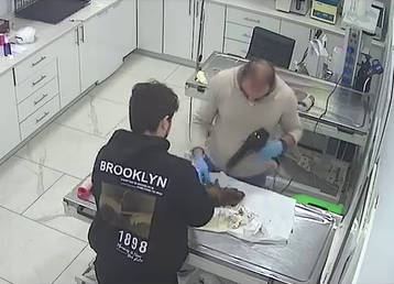 In the clip, the brown dog approaches the clinic’s doors and gently drops a puppy it had been carrying its mouth.