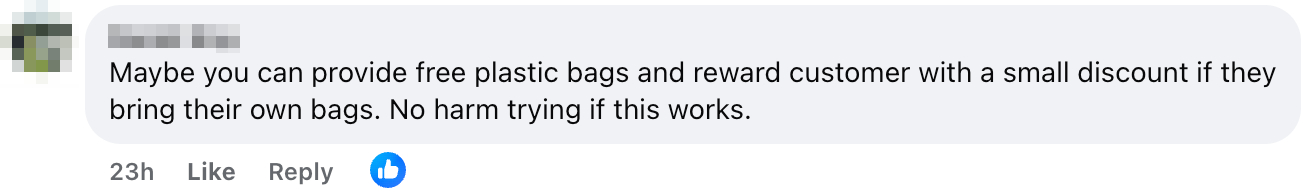 Others offered constructive suggestions, such as incentivising customers to bring their own bags by offering small discounts, rather than charging for plastic bags outright.