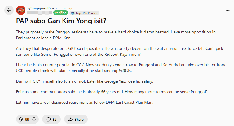 On Wednesday (23 Apr), a Redditor made their stance clear. A post titled “PAP sabo Gan Kim Yong is it?” attracted over 80 comments within hours.