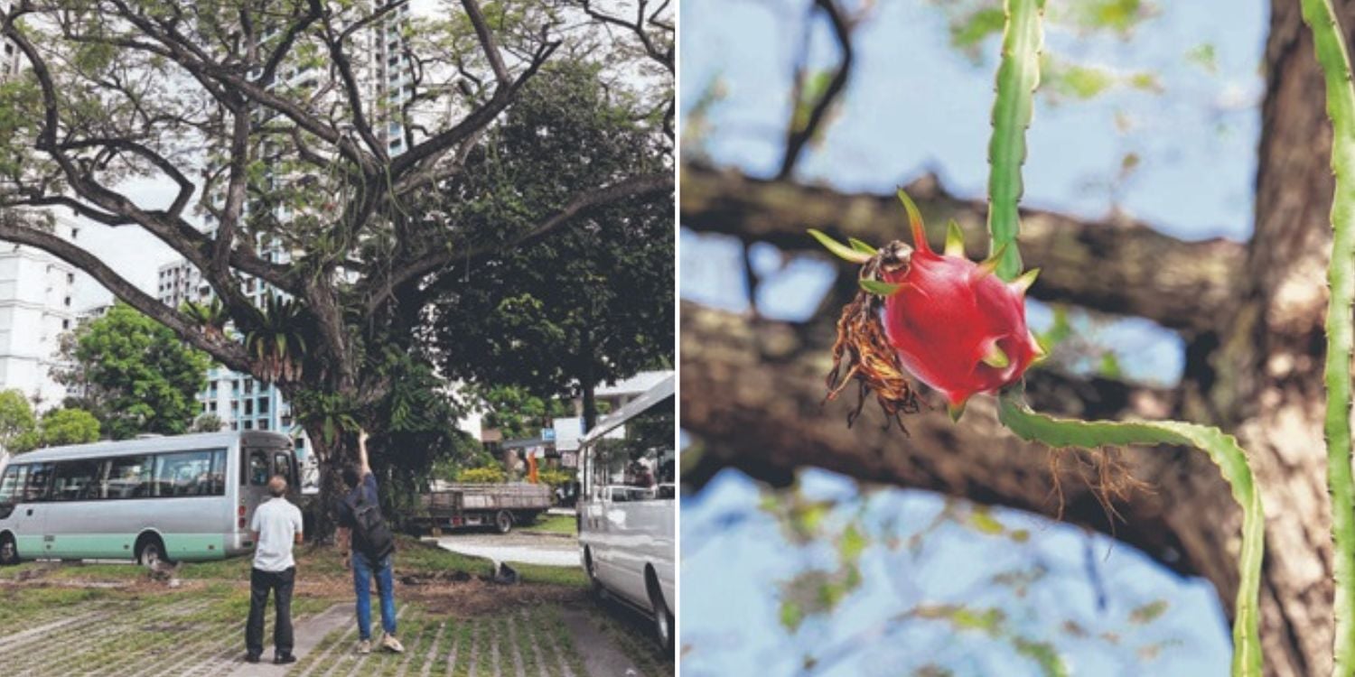 Residents in Ang Mo Kio were left stunned after discovering several ripe dragon fruits growing from a towering 50-year-old tree in a car park.